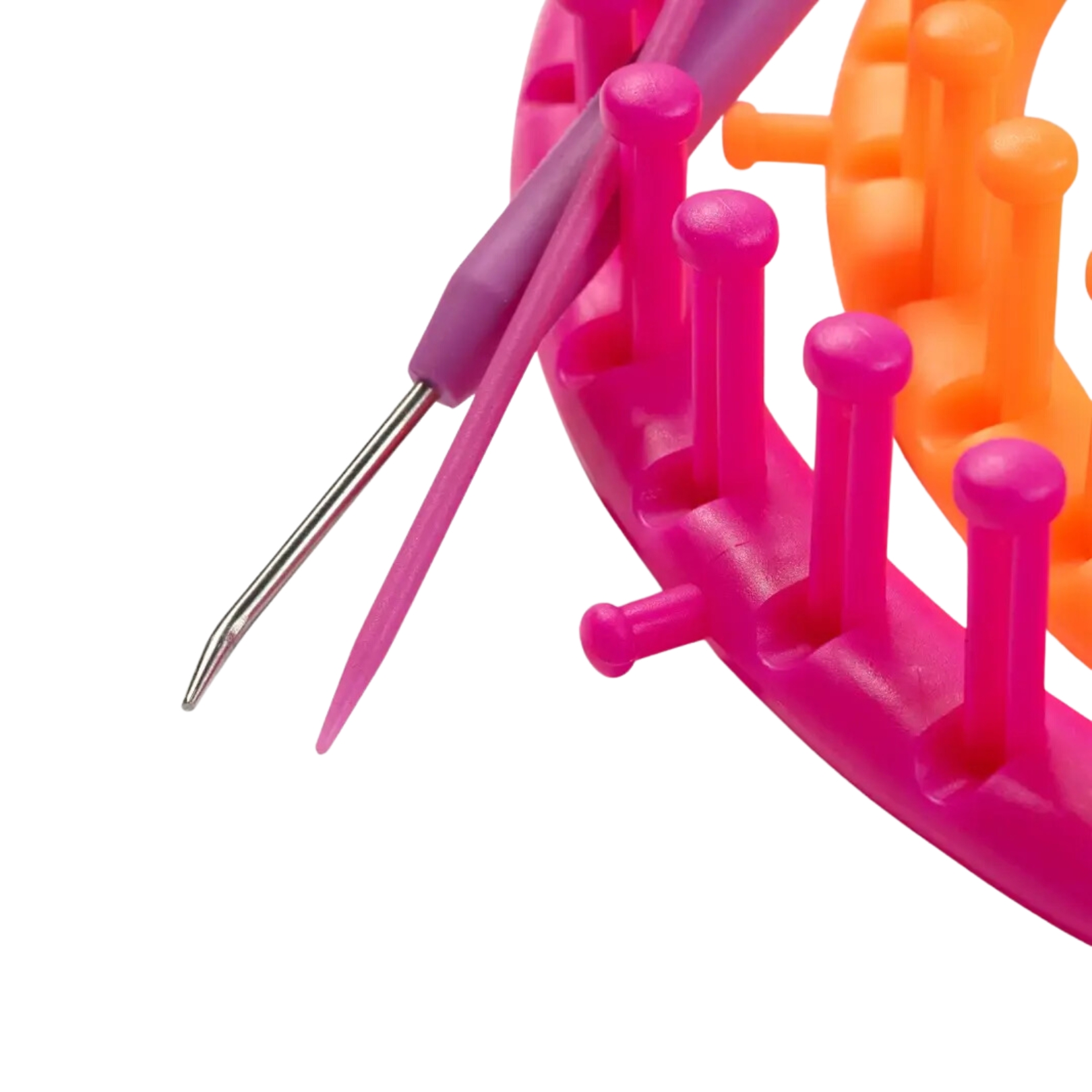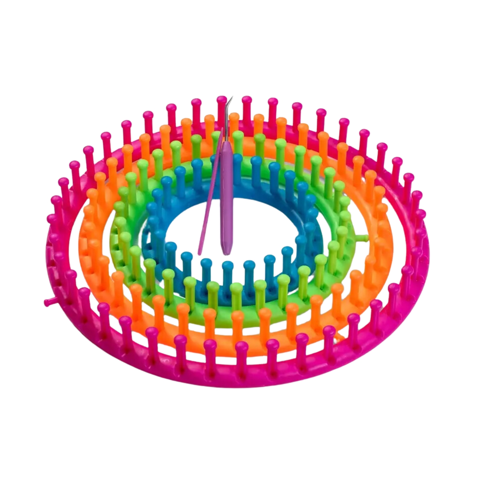 This circular knitting ring set allows you to make multiple creations. This pack includes 4 circular knitting spool of 13.5 cm, 18 cm, 23 cm and 28 cm. Supplied with a hook and a sewing needle.