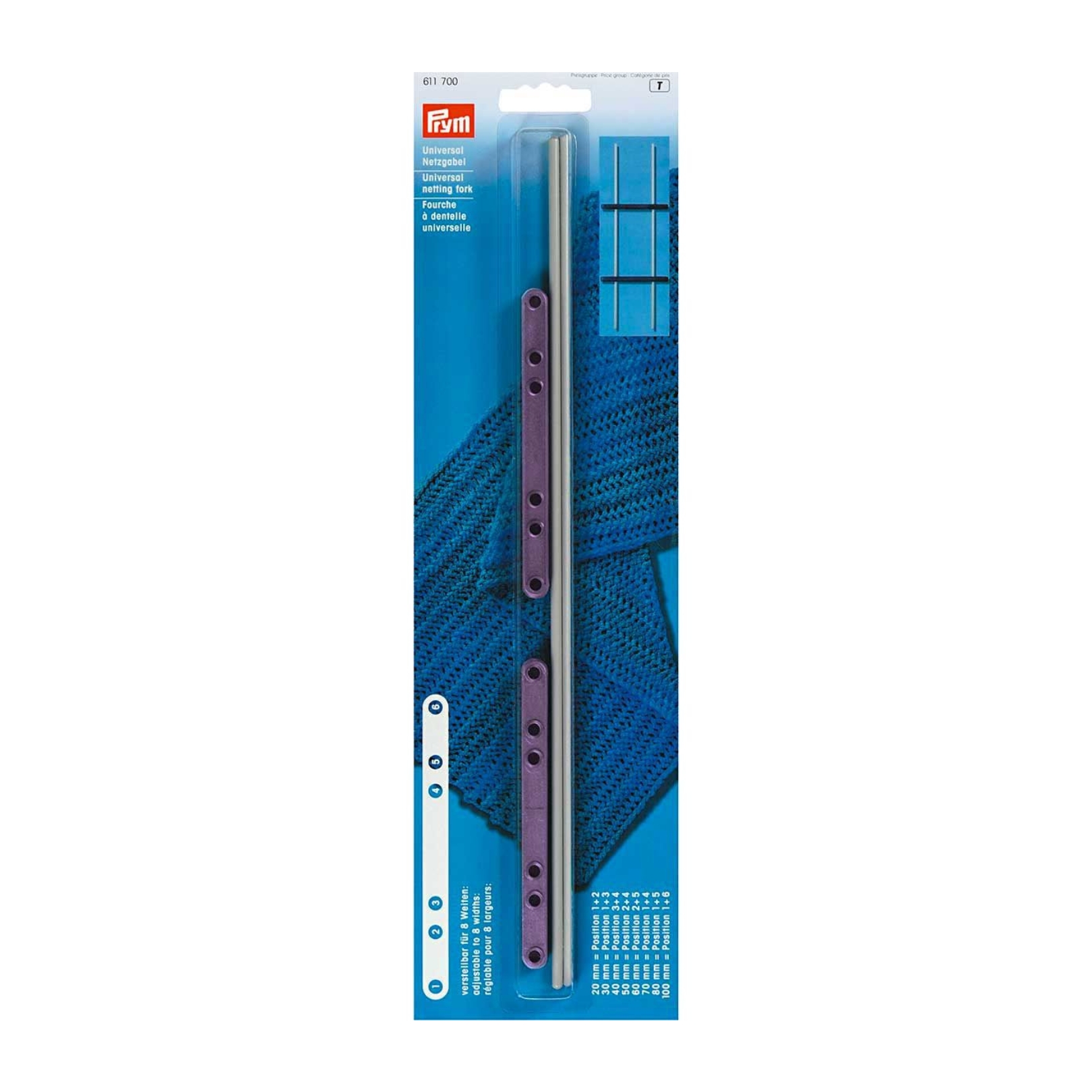 The Prym universal lace fork is an adjustable frame for crocheting wool net strips with the lace fork, to be crocheted later according to the project. The adjustable frame can be assembled from 20 mm to 100 mm in 8 different widths. This universal lace fork is made of aluminum and plastic.