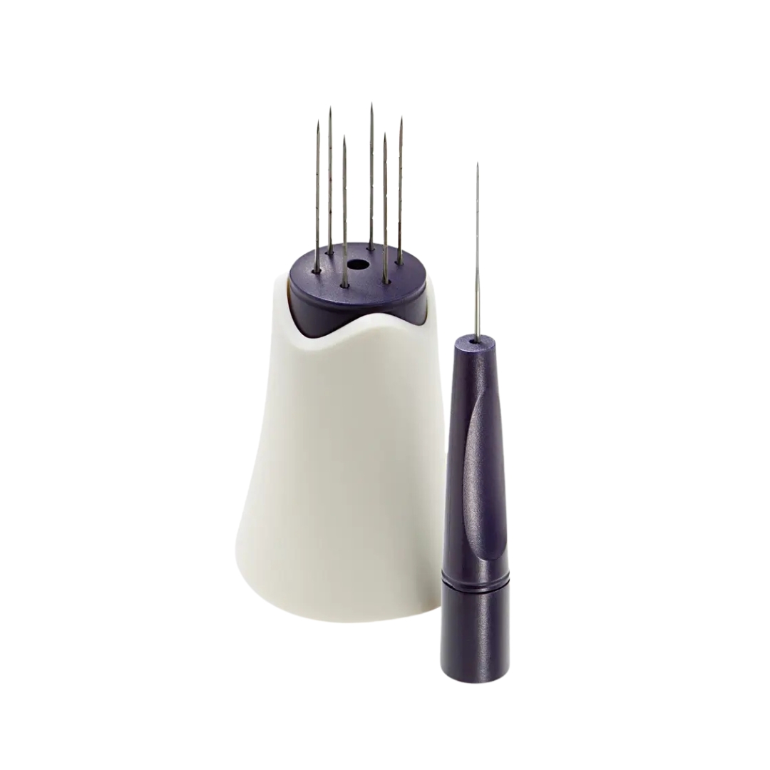 Set de poignées violet foncé et blanc pour aiguilles pour feutres secs, convient pour ranger les aiguilles pour feutre de dimension 78 à 90 mm. Il comprend un support de 6 aiguilles pour feutre, 1 poignée pour l'aiguille à feutrer Livré sans aiguilles
