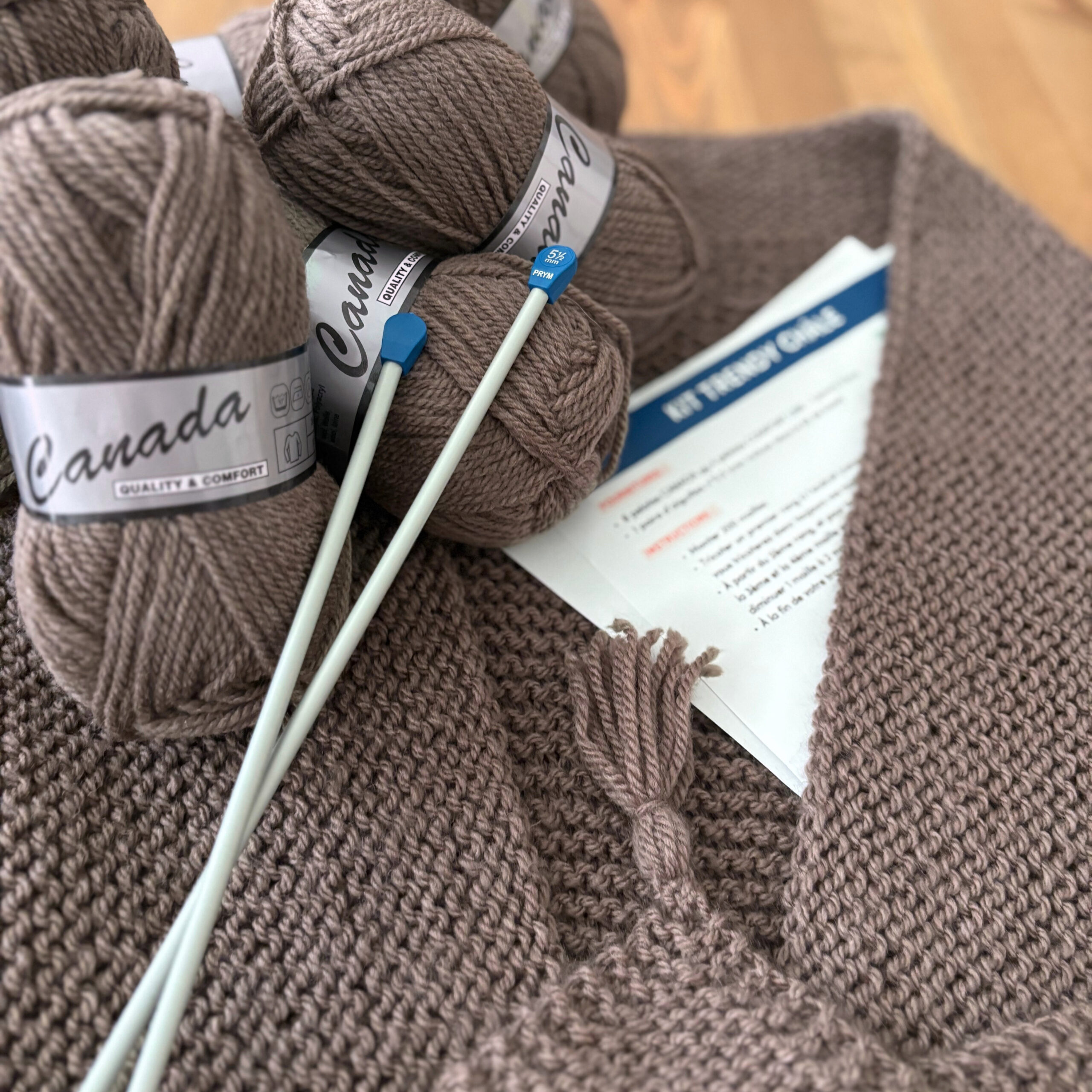 Ce kit tricot vous permettra de réaliser un joli trendy châle d’environ 160 x 80 cm. Nous avons imaginé et réalisé le modèle de ce châle avec un fil doux, en Laine et Acrylique, et certifié par le label Oeko-Tex Standard 100.