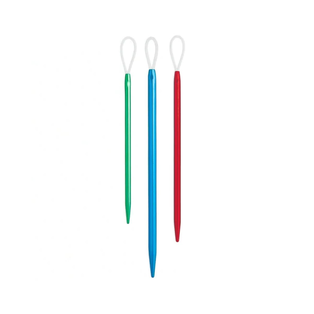 Le lot de 3 aiguilles à laine avec œil en nylon est idéal pour broder ou pour coudre des vêtements de laine. Les aiguilles, disponibles en différentes tailles, sont fabriquées en aluminium anodisé bleu, rouge et vert et possèdent, au lieu d’un chas classique, une boucle en nylon pour enfiler facilement le fil. Le chas en nylon est flexible et permet aux aiguilles à laine de glisser facilement à travers les mailles de vos ouvrages. De plus, la pointe arrondie de ces aiguilles à laine protège et préserve les fibres de laine. Leur faible poids et leur ergonomie permettent une agréable prise en main.