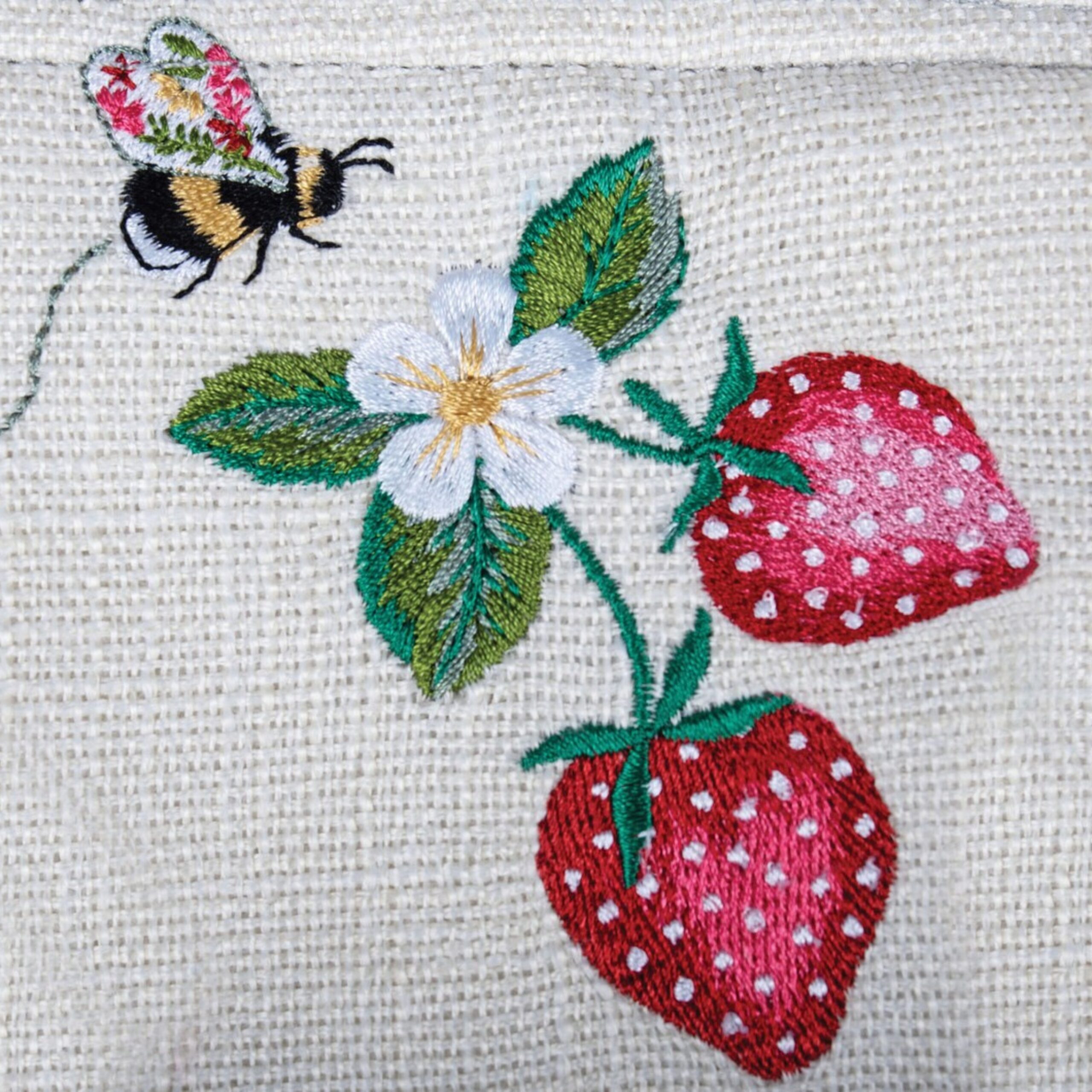 Laissez-vous séduire par ce grand sac à ouvrage, aussi joli que pratique, de la marque Hobby Gift ! Le sac zippé à double poignée est fabriqué en tissu 100% Coton avec un imprimé fraises naturelles et un motif abeille brodé sur le devant. Il est idéal pour ranger et transporter votre matériel de tricot ou de crochet et vos ouvrages en cours.